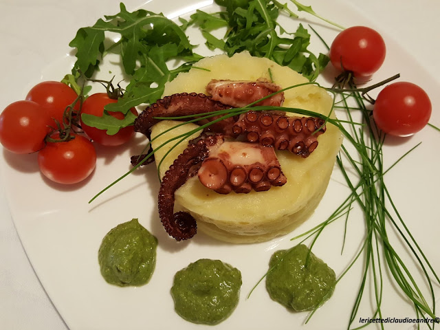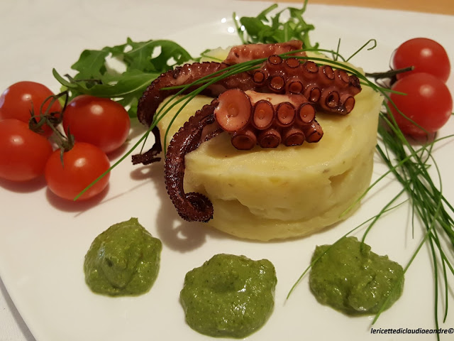 Purea di patate aromatizzato con erba cipollina, polpo e salsa con foglie di broccoli e noci