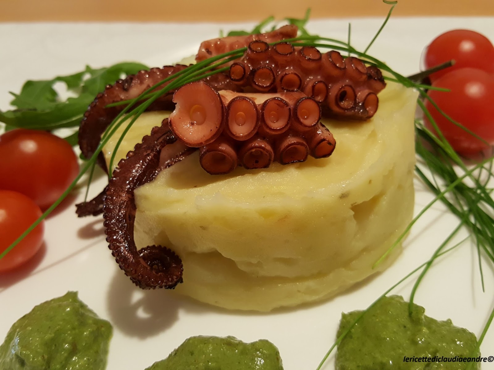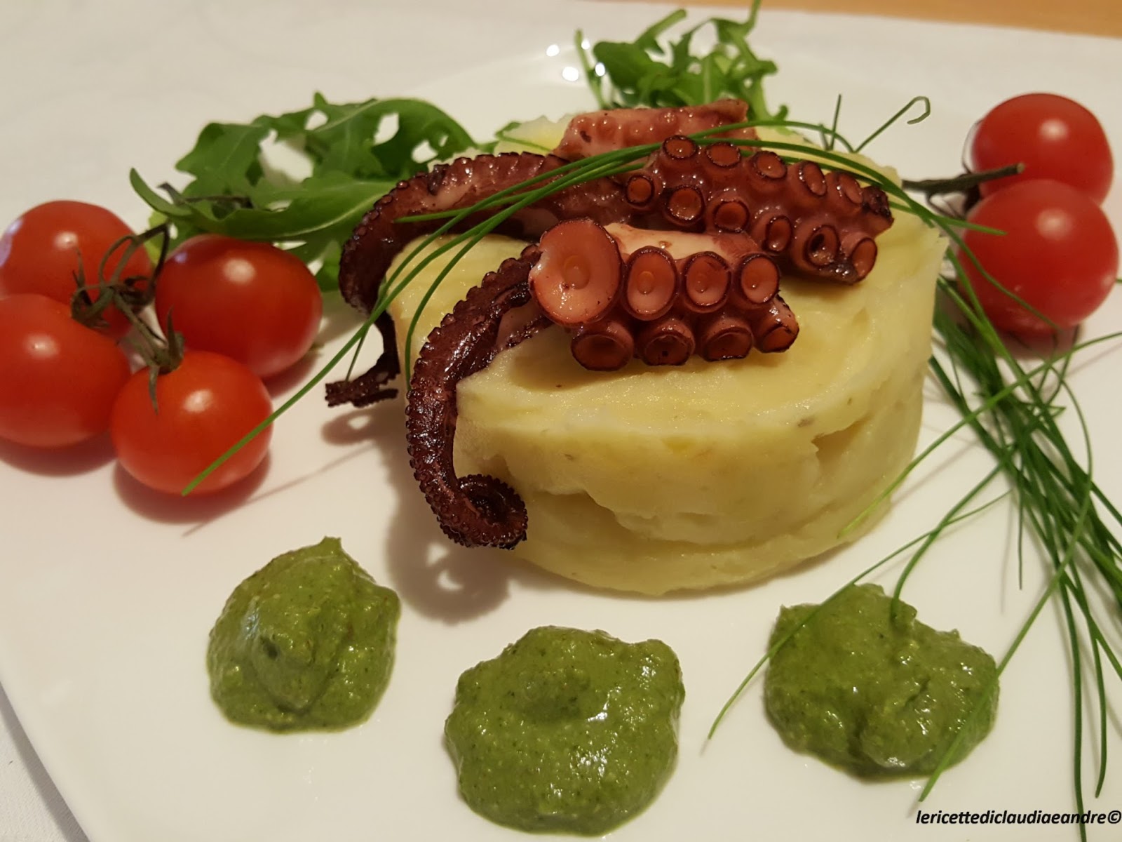 - Ora che tutto è pronto, si può impiattare mettendo in ogni piatto un pò di purea di patate, qualche pezzettino di polpo, rucola, pomodorini, erba cipollina e non resta che dire buon appetito !