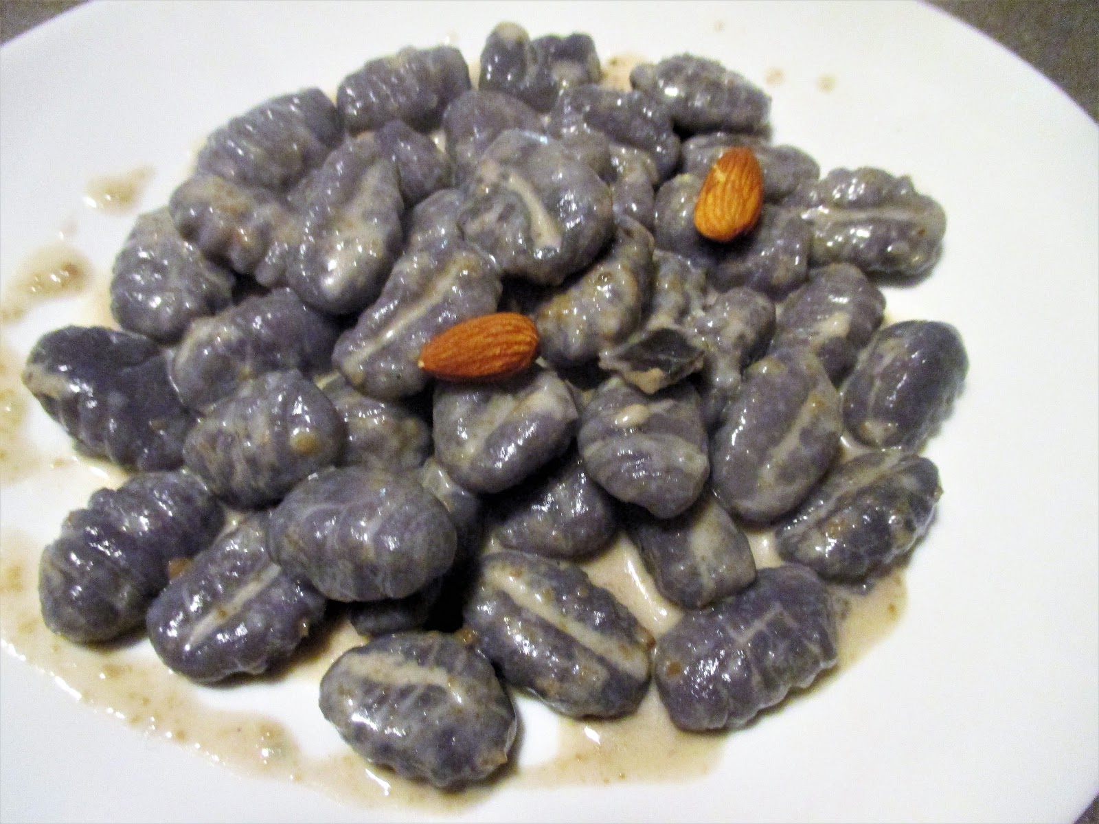 Fate cuocere gli gnocchi in abbondante acqua bollente. A cottura ottenuta condite con la salsa e le mandorle.