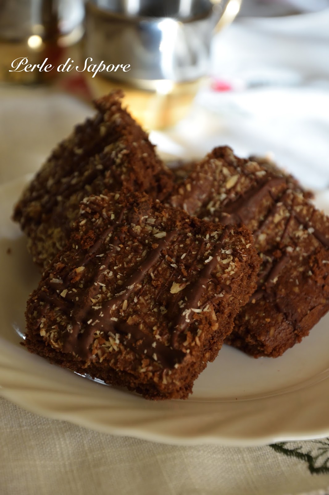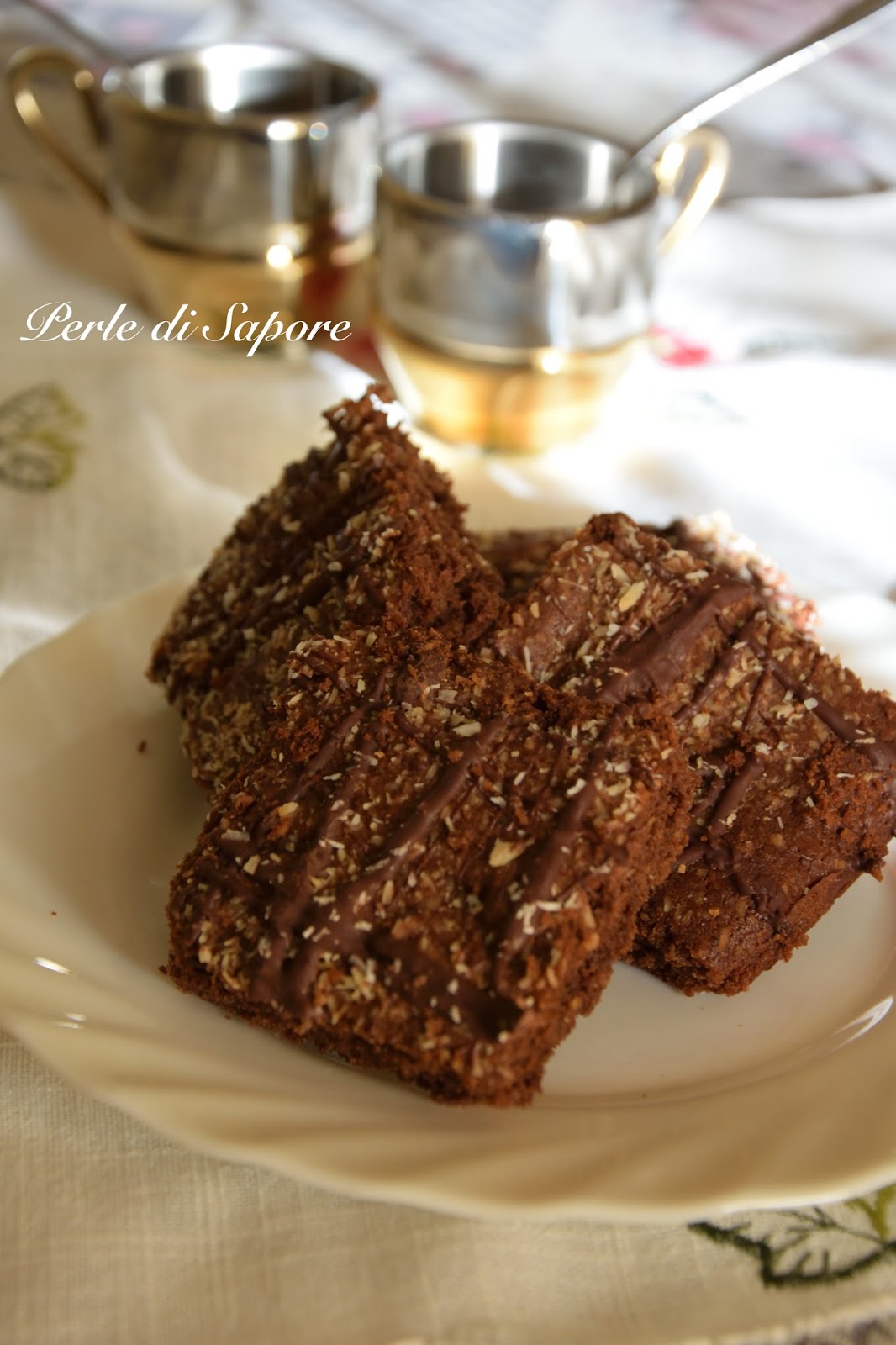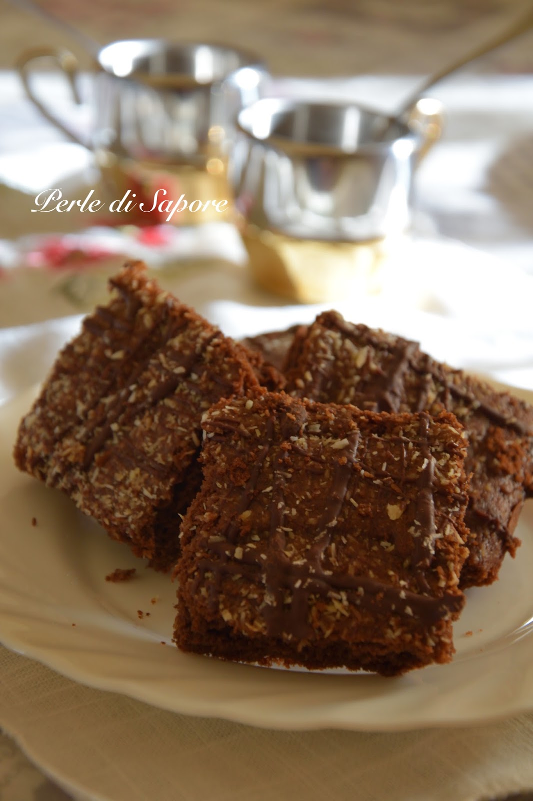 Una volta giunto a cottura, tagliate la base in quadrotti e decorate con il cioccolato sciolto e una spolverata di scagliette di cocco.