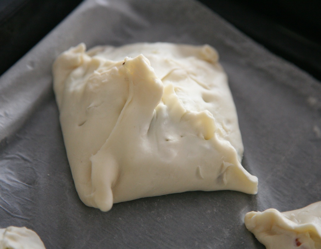 Mettere al centro di ogni quadrotto un po’ di ripieno, broccoli e scamorza e richiudere i lembi a due a due. Sigillare bene per evitare che il ripieno possa fuoriuscire in fase di cottura.
