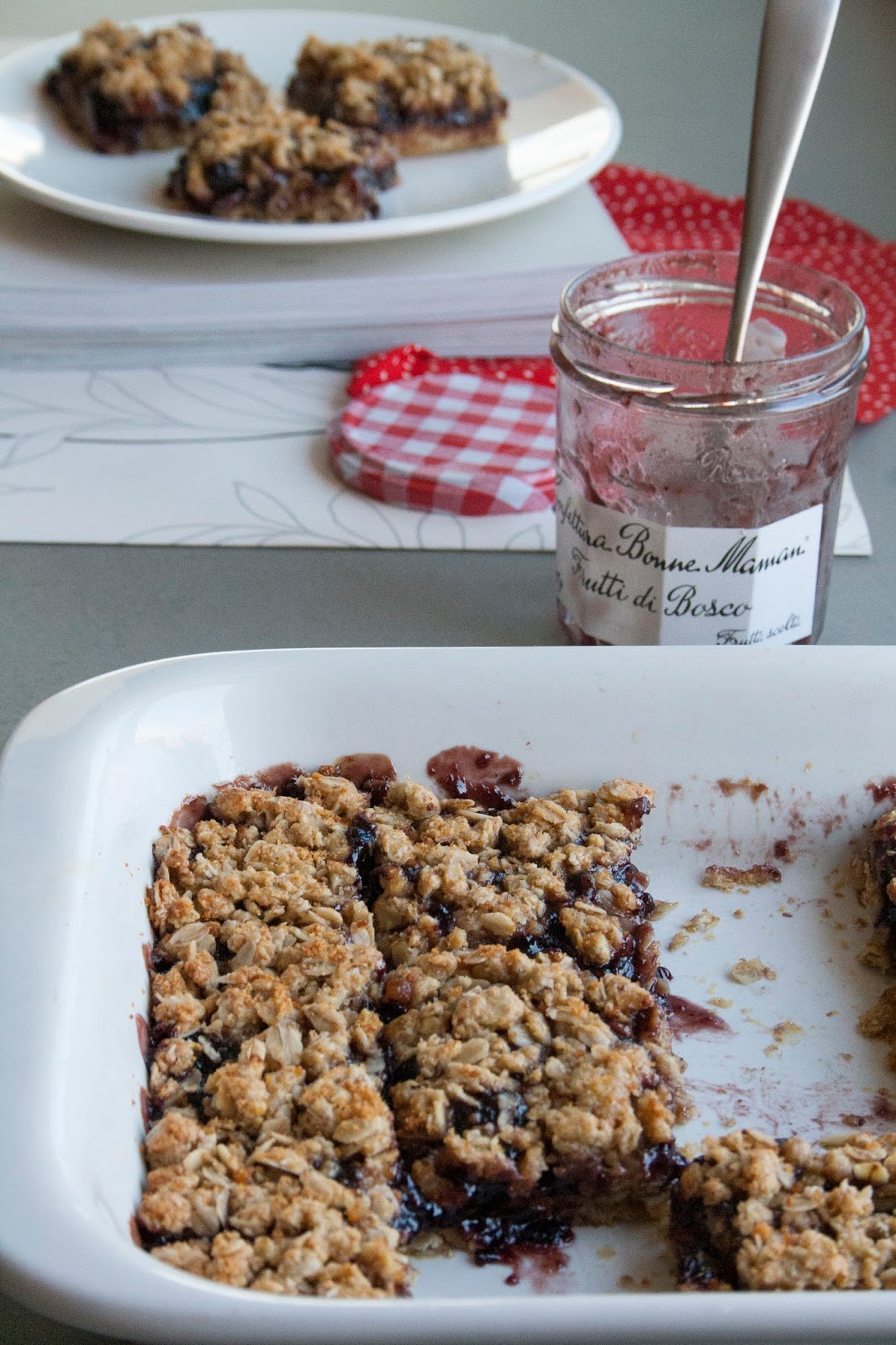 Versare metà composto nello stampo, coprire con la confettura e poi coprire con la restante metà di impasto ai fiocchi d’avena.