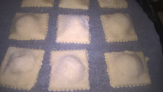 Stendere con il mattarello la frolla spolverizzando il piano con un velo di farina. Posizionare una cucchiaiata di ripieno  in mucchietti distanziati.