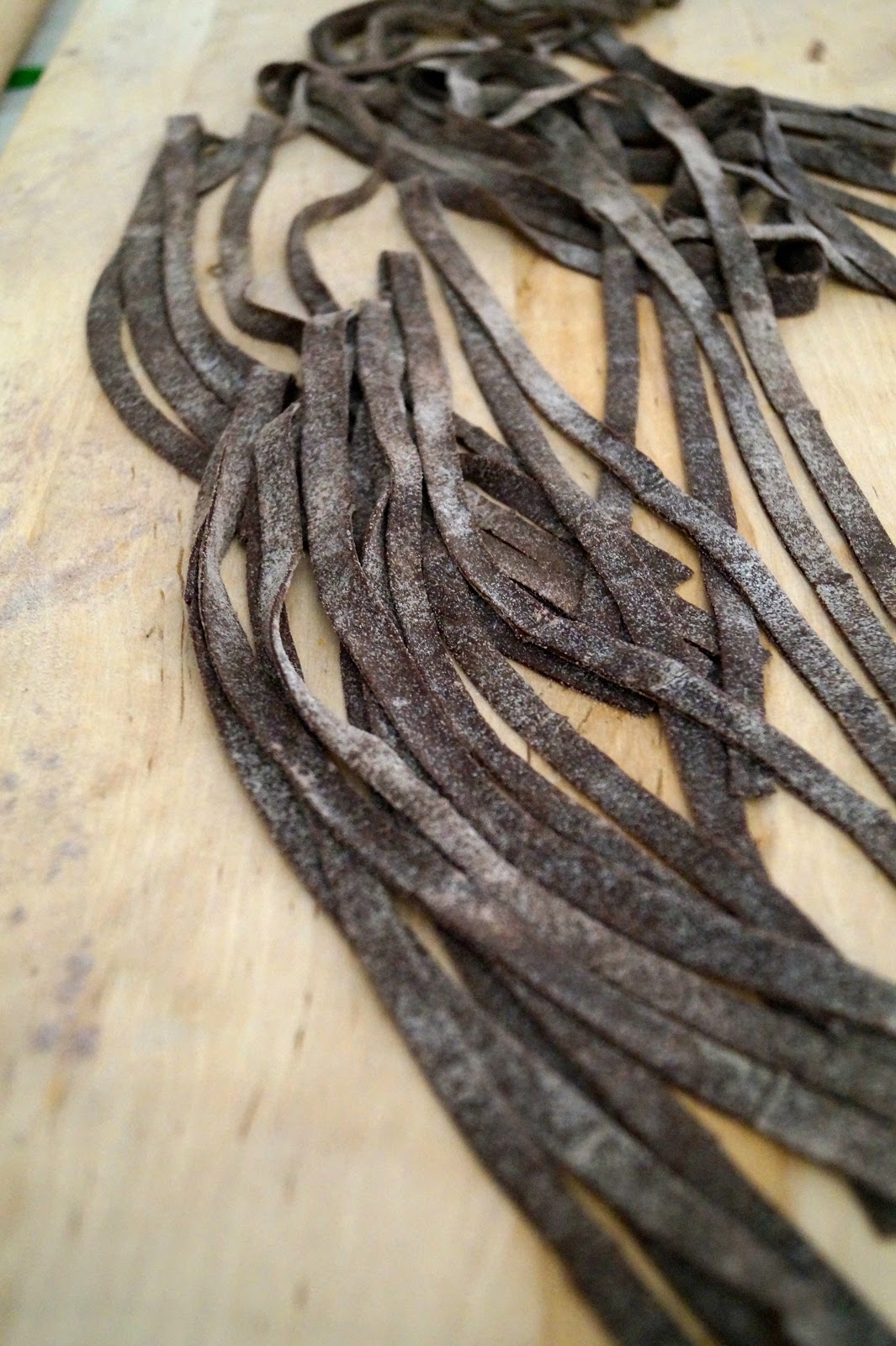 Procedete come fare una normale pasta con uova ma ricordatevi di setacciare il cacao e mescolarlo bene alla farina prima di formare la fontana dove mettere le uova , Formare il panetto di pasta e lasciarlo riposare 30 minuti poi stendere una sfoglia sottile e quando si sarà un po seccata tagliamola per ricavarne delle tagliatelle