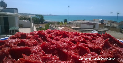 “Fari u strattu” nella mia provincia, Ragusa, non è una preparazione culinaria come altre, è un vero e proprio rito a cui tutta la famiglia deve sottostare. Ognuno, dai più piccoli ai più grandi,ha un ruolo adeguato all’età e al fisico; è un’operazione lunga, dura almeno tre giorni e non ci si possono concedere pause e distrazioni perchè il risultato potrebbe essere fatalmente compromesso. Quando ero piccola il mio compito era quello di girare la manovella della macchina spremipomodoro e poi quello più divertente di “riminare” quelle distese di passata di pomodoro nelle “maidde” al sole: durante quella continua operazione nelle ore più assolate della giornata, ci si abbronzava e si diventava di colore rosso fuoco; ogni tanto un dito si tuffava in quella crema golosa per leccarlo di nascosto. I grandi invece dissertavano se la luna fosse nel quarto propizio o se il vento fosse quello giusto: il terrore era ed è lo scirocco che invece di far addensare il pomodoro lo fa inacidire; bisognava far attenzione che le mosche, golose anche loro, non si tuffassero in quel mar rosso. Quando poi diventava denso come marmellata si teneva ancora qualche giorno “o friscu” in modo che si stabilizzasse, quindi veniva riposto nei vasi di vetro, più anticamente invece erano di terracotta “i stipa” e conservato per i sughi ghiotti dell’inverno. Ora sempre meno famiglie si dedicano a questo rito, specialmente se non si ha la possibilità di una casa in campagna o di un terrazzo abbastanza ampio: la tradizione va via via abbandonata dalle nuove generazioni.