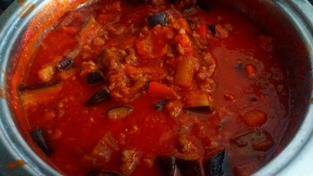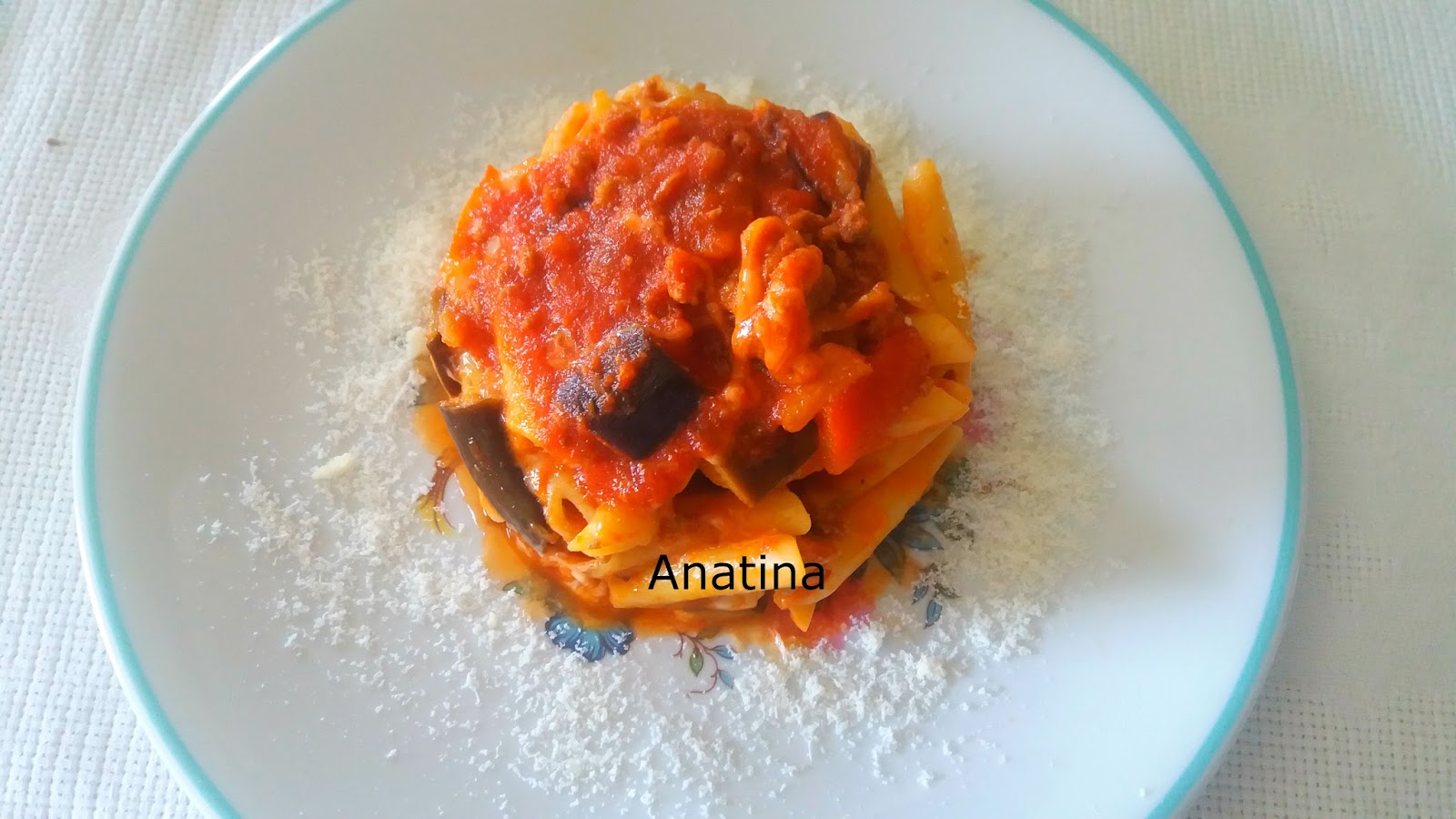 1 melanzana(lavata) tagliata a cubetti e fritta in olio evo e aglio in camicia