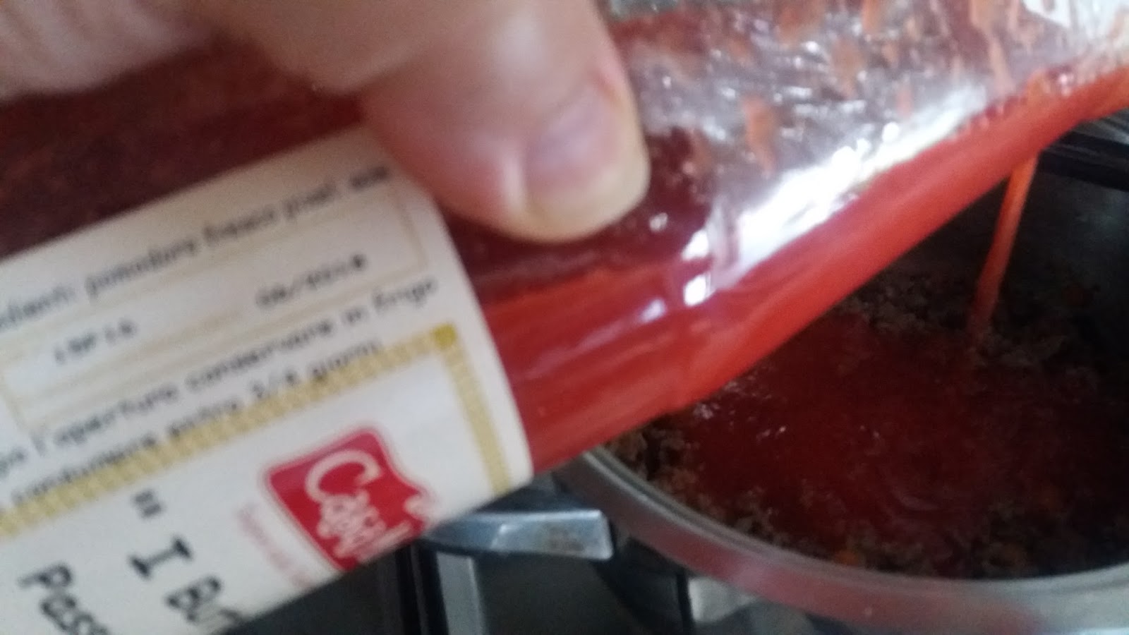 Versare il pomodoro,aggiungere acqua (quel tanto x pulire la bottiglia e ce ne vorra’ davvero poco