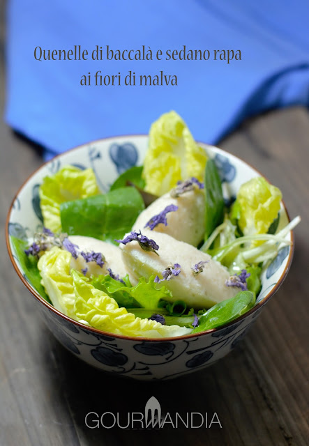 *Nella ricetta il latte di cottura per baccalà e sedano rapa non è aromatizzato; io ho aggiunto scalogno, alloro e pepe in grani. Al posto del pane grattato ho usato dei fiori di malva, per un aspetto primaverile e perché volevo servire le quenelle a temperatura ambiente. La versione con il pane grattato è ottima, specie se il pesce viene servito appena sfornato.