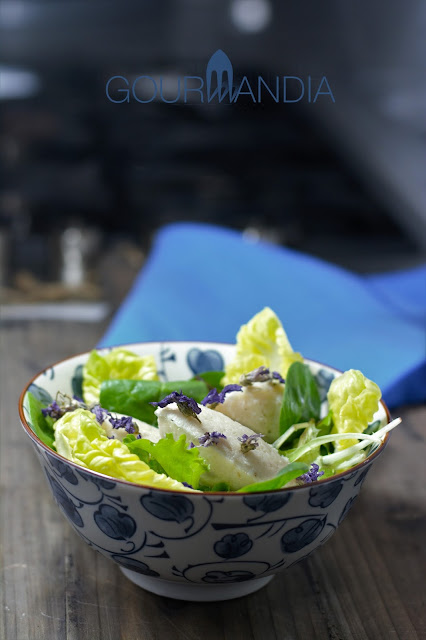 Una considerazione sul pane grattato. Può essere evitato e sostituito con erbe, spezie o fiori, come ho fatto io aggiungendo all’insalata dei fiori di malva, più adatti al periodo primaverile. Ma se decidete di usarlo come nella ricetta origiale, è importante che sia fatto in casa, con pane secco avanzato e frullato nel mixer con un pizzico di sale e rosmarino tritato; a me piace che sia irregolare, tritato grossolanamente. Il pangrattato comprato, avendo una grana molto fine rischia di ammorbidirsi durante la cottura senza diventare croccante, mentre è proprio la crosticina tostata l’effetto che si vuole ottenere, in contrasto con la morbidezza della quenelle.