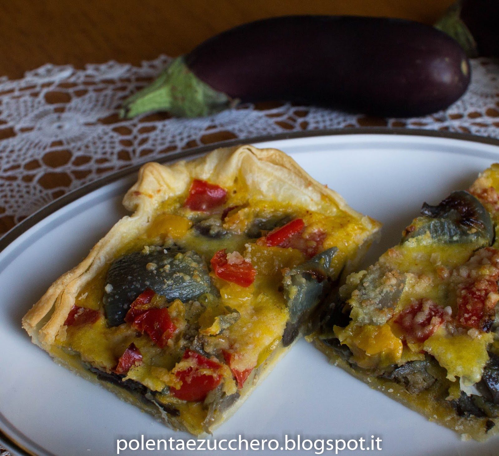 Prima di tutto mondare e lavare le verdure. Tagliare la melanzana a piccoli pezzetti, raccoglierli in un tegame con poco olio e cuocerli per una decina di minuti mescolando spesso, poi salarli. Procedere allo stesso modo con i peperoni cioè tagliarli a cubetti, cuocerli e salarli. Tagliare gli scalogni cercando di ottenere dei pezzi più grossi, metterli in un pentolino con un decilitro di acqua e cuocerli fino a quando il liquido sarà evaporato, alla fine salarli. Accendere il forno a 200°. Distendere in una teglia la pasta sfoglia e dopo averla bucata sul fondo con una forchetta infornarla per pochi minuti (6-8′). Toglierla dal forno e cospargerla con qualche cucchiaiata di pangrattato, distribuire i cubetti di melanzana, quelli di peperoni e i pezzi di scalogno. In una ciotola riunire le tre uova intere, un generoso pizzico di sale, una spolverata di peperoncino in polvere, due cucchiaiate di farina, due cucchiai di grana grattugiato e mezzo bicchiere di latte poi amalgamare tutti gli ingredienti insieme, versare il composto ottenuto sulla sfoglia cercando di distribuirlo bene tra le verdure, a piacere cospargere con poco grana quindi infornare per circa 40′. Quando la superficie si sarà dorata un po’ e la pasta sfoglia del bordo sembrerà cotta, sfornare la torta salata. Lasciarla intiepidire prima di servirla.