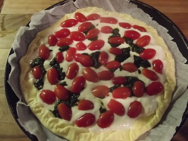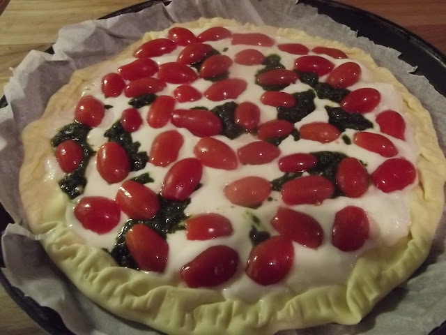 Srotolate la pasta sfoglia, bucherellatela con i rebbi di una forchetta, quindi iniziate a farcirla con la crescenza spalmandola su tutta la sfoglia, qualche cucchiaino di pesto di qua e di la’ , infine i pomodorini lavati e tagliati a meta’.