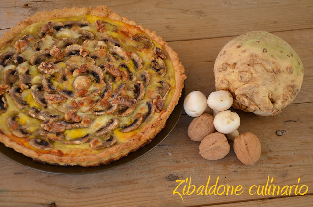 Qui vi lascio la mia ricetta: Torta salata con crema di sedano rapa, funghi e noci, che poi in realtà è una quiche, come dice il titolo del post, infatti presenta l’“appareil” (l’uovo e latte sbattuto ) distribuito sulla superficie della farcitura prima della cottura in forno.