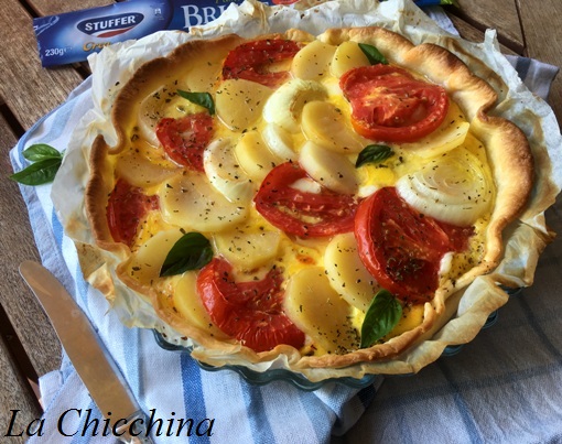 Io ho scelto di farcire la mia quiche con patate, cipolle, pomodori freschi, una cremina deliziosa fatta con uova e parmigiano e fette di scamorza ad arricchire l’insieme… Una generosa spolverata di origano completa la preparazione.