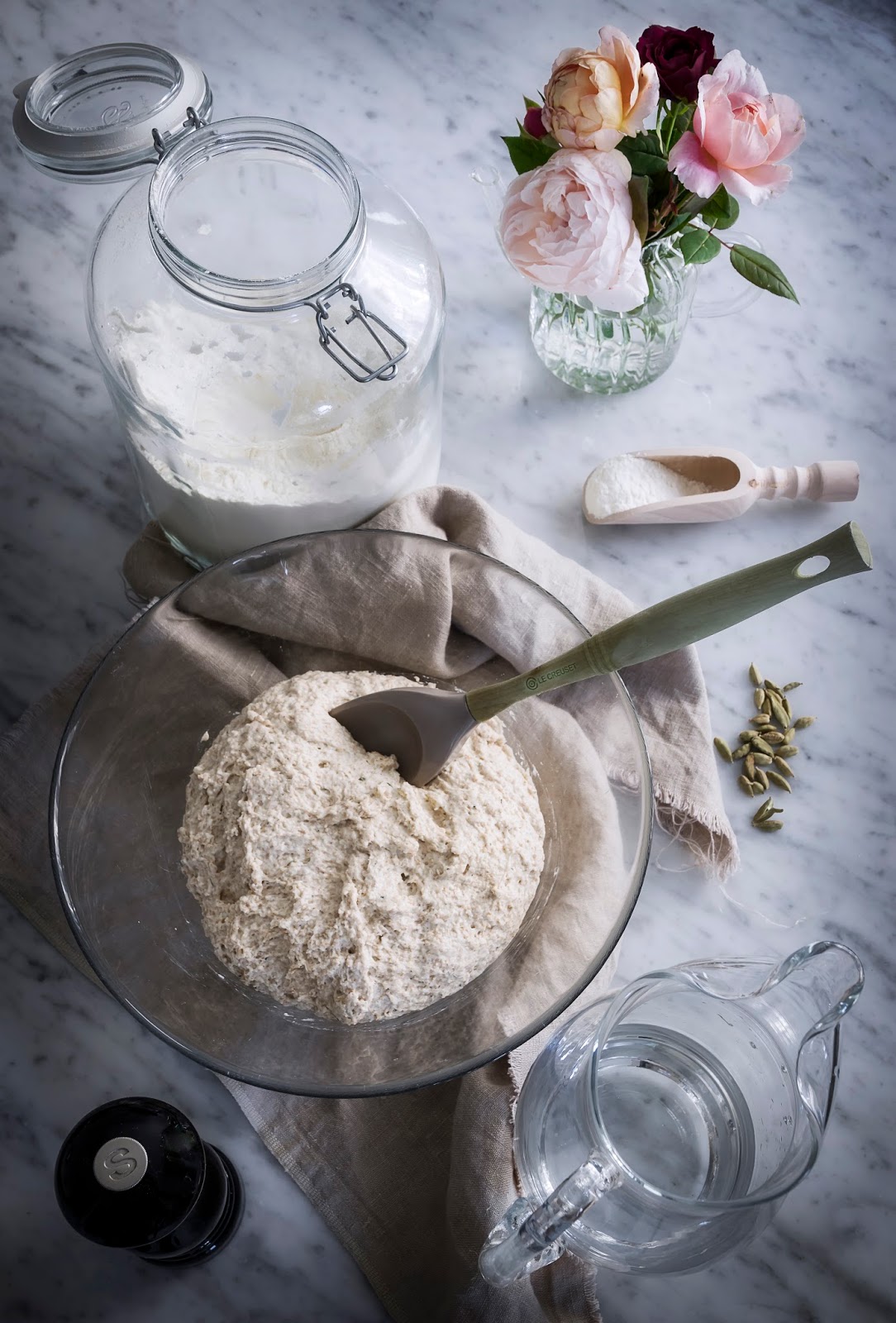 Per questa versione ho utilizzato farine integrali e tipo 0 in percentuale del 50% ed aromatizzato il tutto con cardamomo e rosmarino: profumatissimo ed invitante.