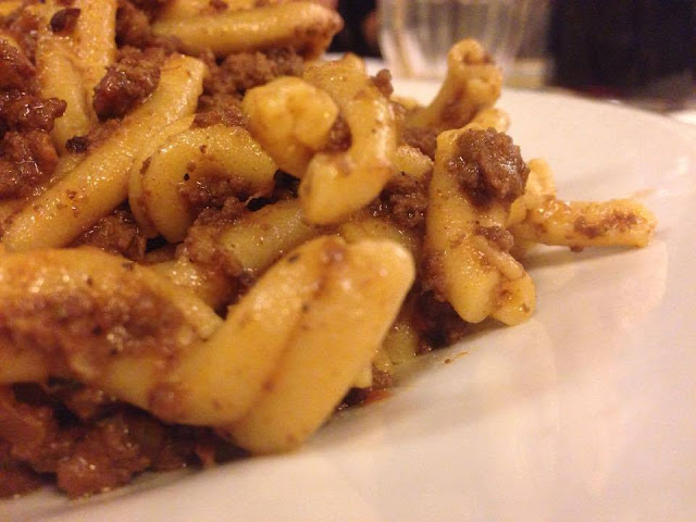 Noi, da buone amiche, decidiamo di partire con un primo condiviso, because caring is sharing, ma soprattutto perché le porzioni sono medio-abbondarti (vivaaa!!!) e non vogliamo toglierci la possibilità di assaggiare qualche secondo. Optiamo quindi per un ricco piatto di Strozzapreti al ragù di cinghiale: il sugo, seppur macinato finemente, è molto saporito, non troppo unto e perfettamente equilibrato; del resto si sa: le carni nere sanno di selvatico e il rischio che risultino un po’ stucchevoli è sempre dietro l’angolo.