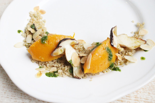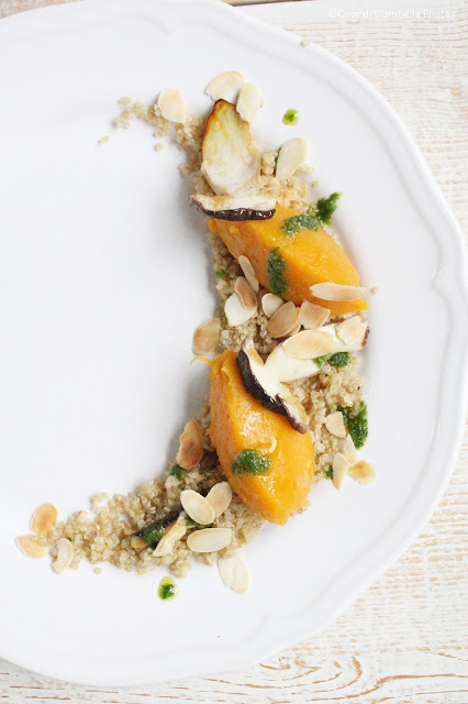 Comporre il piatto stendendo la quinoa sul piatto, adagiando delle quenelle di zucca, i porcini e condire con gocce di emulsione al prezzemolo e mandorle a scaglie tostate. Lucidare con un filo di olio. Questo piatto è perfetto servito caldo o tiepido. Se non avete voglia di far questo potete amalgamare assieme tutti gli ingredienti e potrebbe diventare anche un perfetto lunch box per il pranzo in ufficio!!!