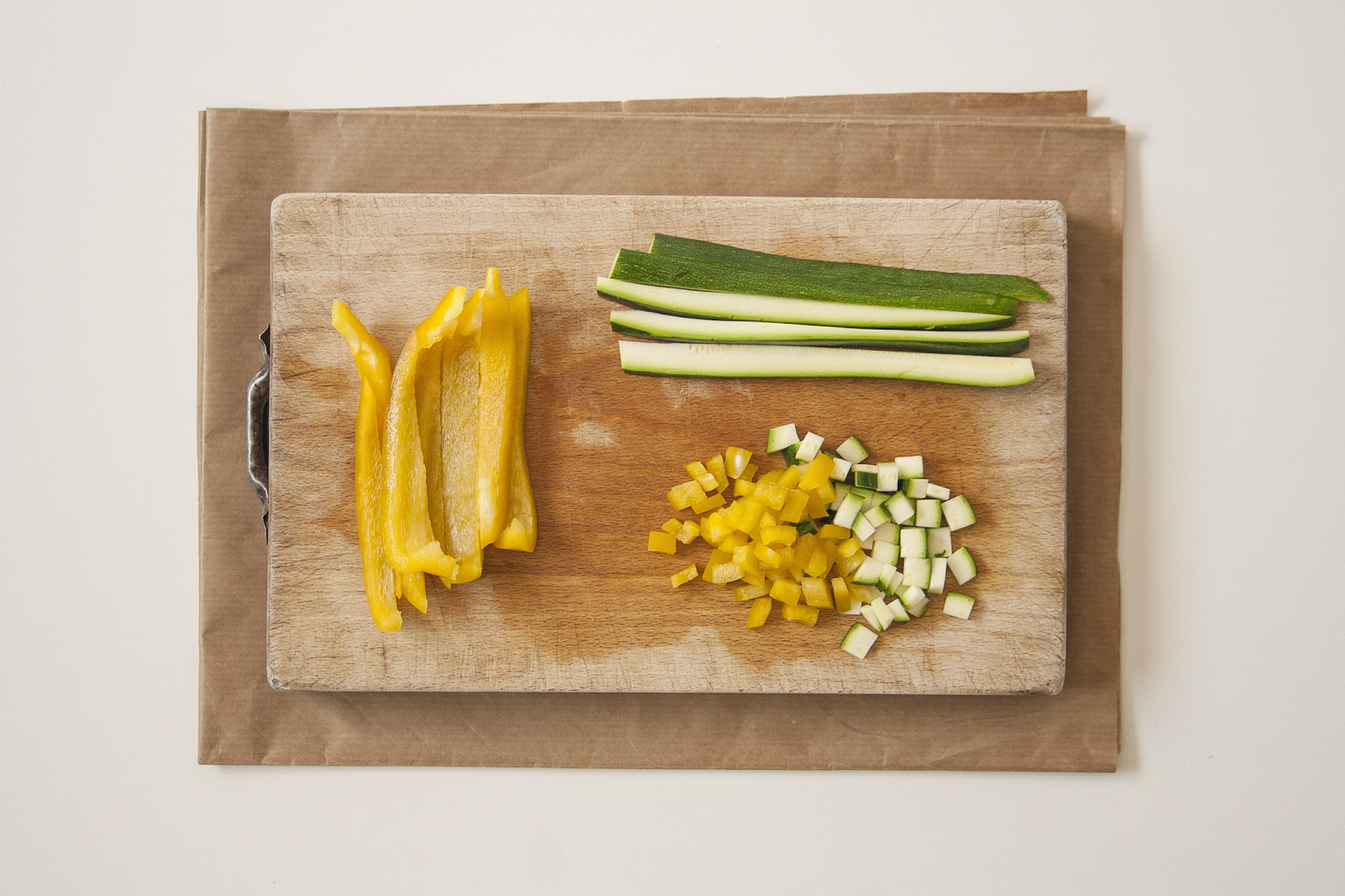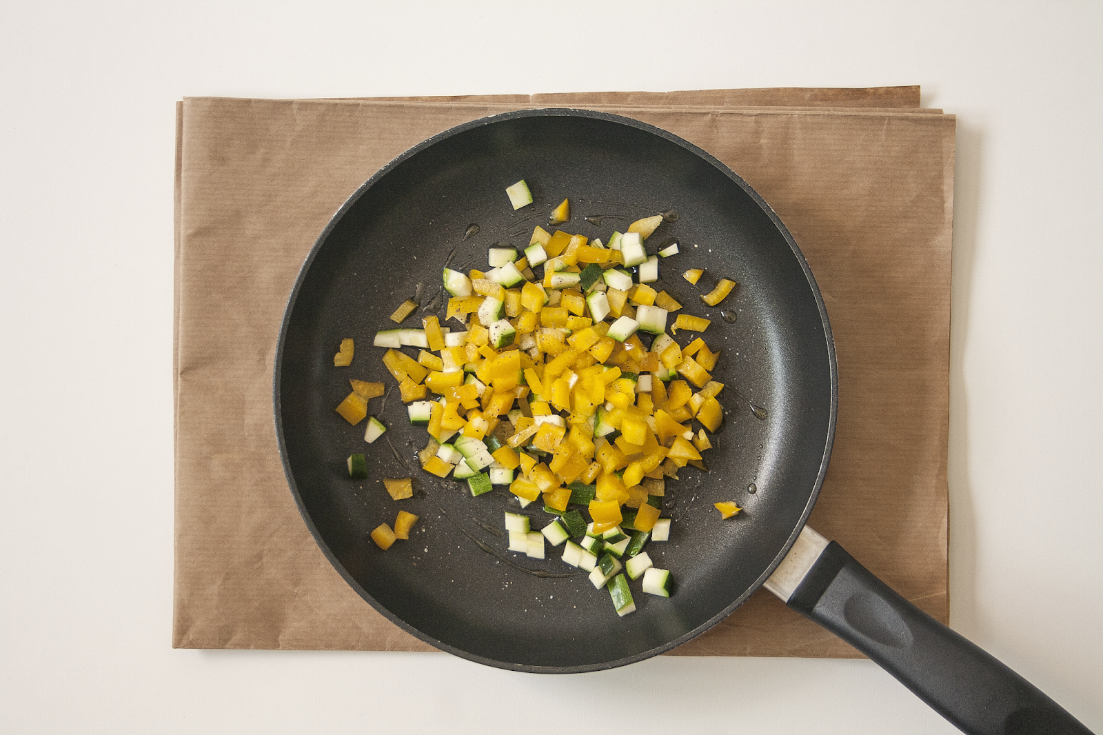 Lavate e pulite accuratamente la zucchina e il peperone e poi riduceteli a dadini. Mettete le verdure ridotte a cubetti in una padella antiaderente e fatele stufare fino a renderle tenere aggiungendo un giro di olio extravergine di oliva, un pizzico di sale fino integrale e di pepe nero.