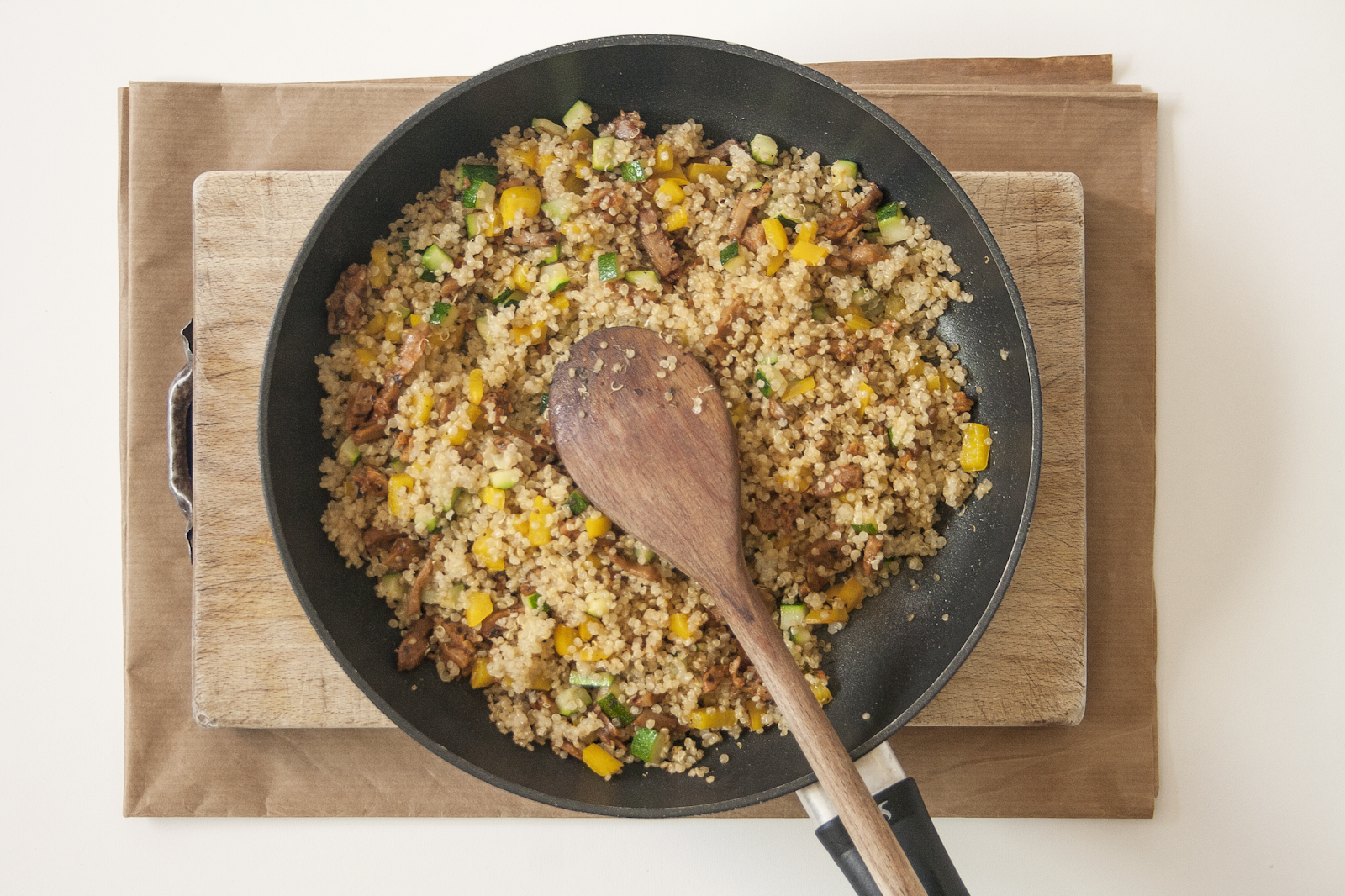 Successivamente unite la quinoa e gli straccetti veggie nella padella dove ci sono le verdure a pezzetti, mescolate con un cucchiaio di legno per far amalgamare gli ingredienti e i sapori tra di loro e poi saltate il tutto per 1 minuto circa, aggiungendo un altro goccio di olio.