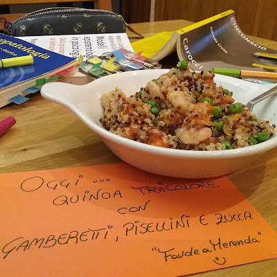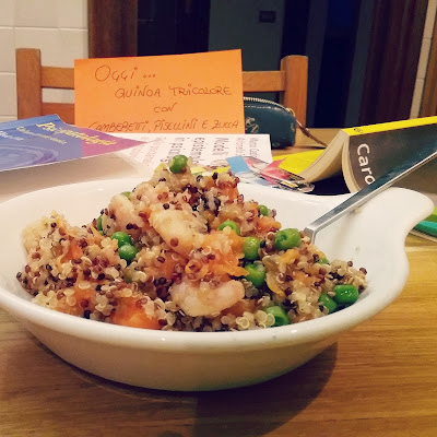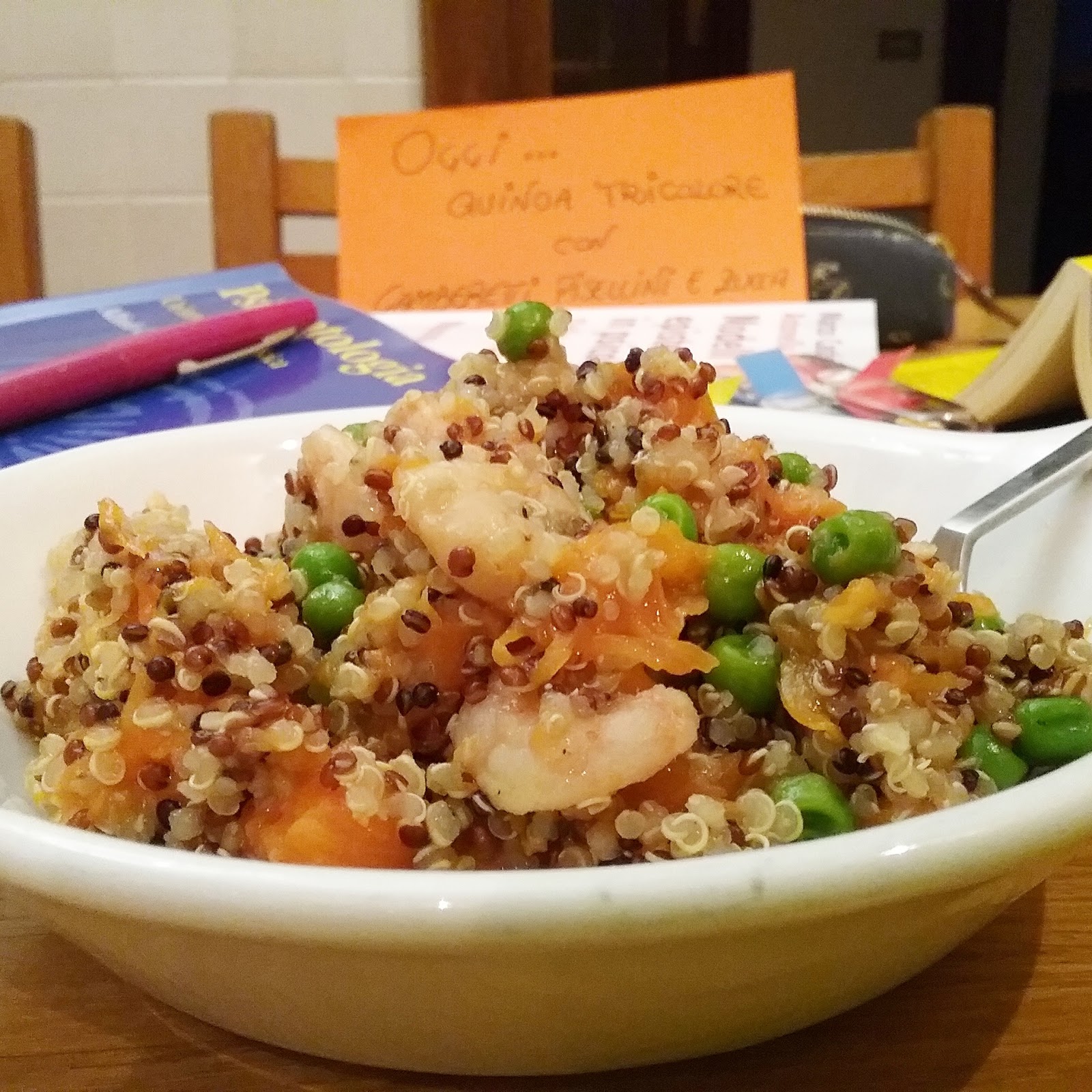 E dato che ha gusti particolari e gli piace sperimentare, oggi si è meritato un’insalata di quinoa tricolore con gamberetti, pisellini e zucca.