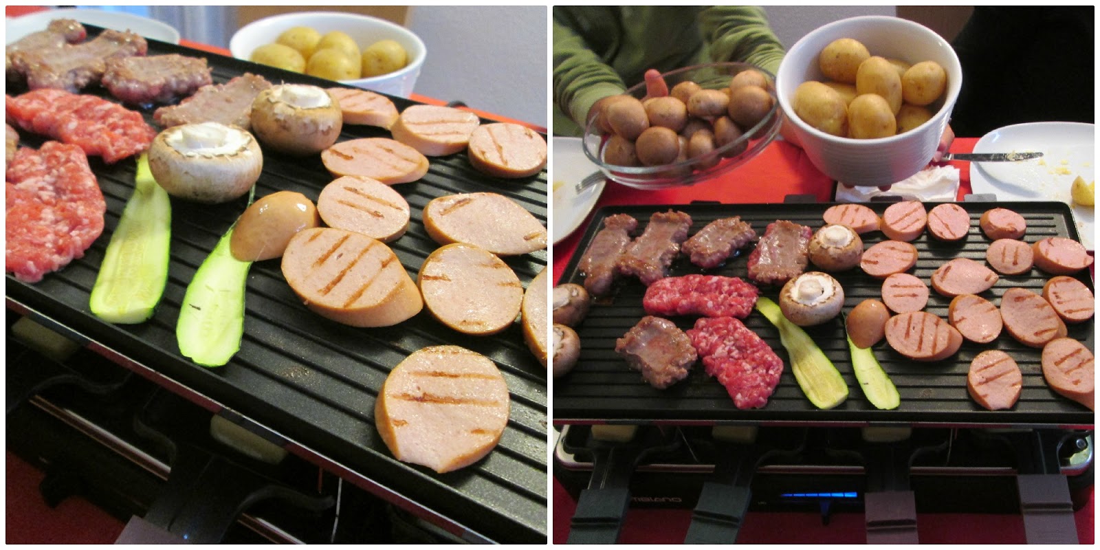 Grigliate ciò che vi pare…poi fondete il formaggio negli appositi padellini e versatelo bollente sulle patate tagliate a metà (le patate, se lavate bene prima della cottura, una volta cotte possono essere consumate con la buccia!)