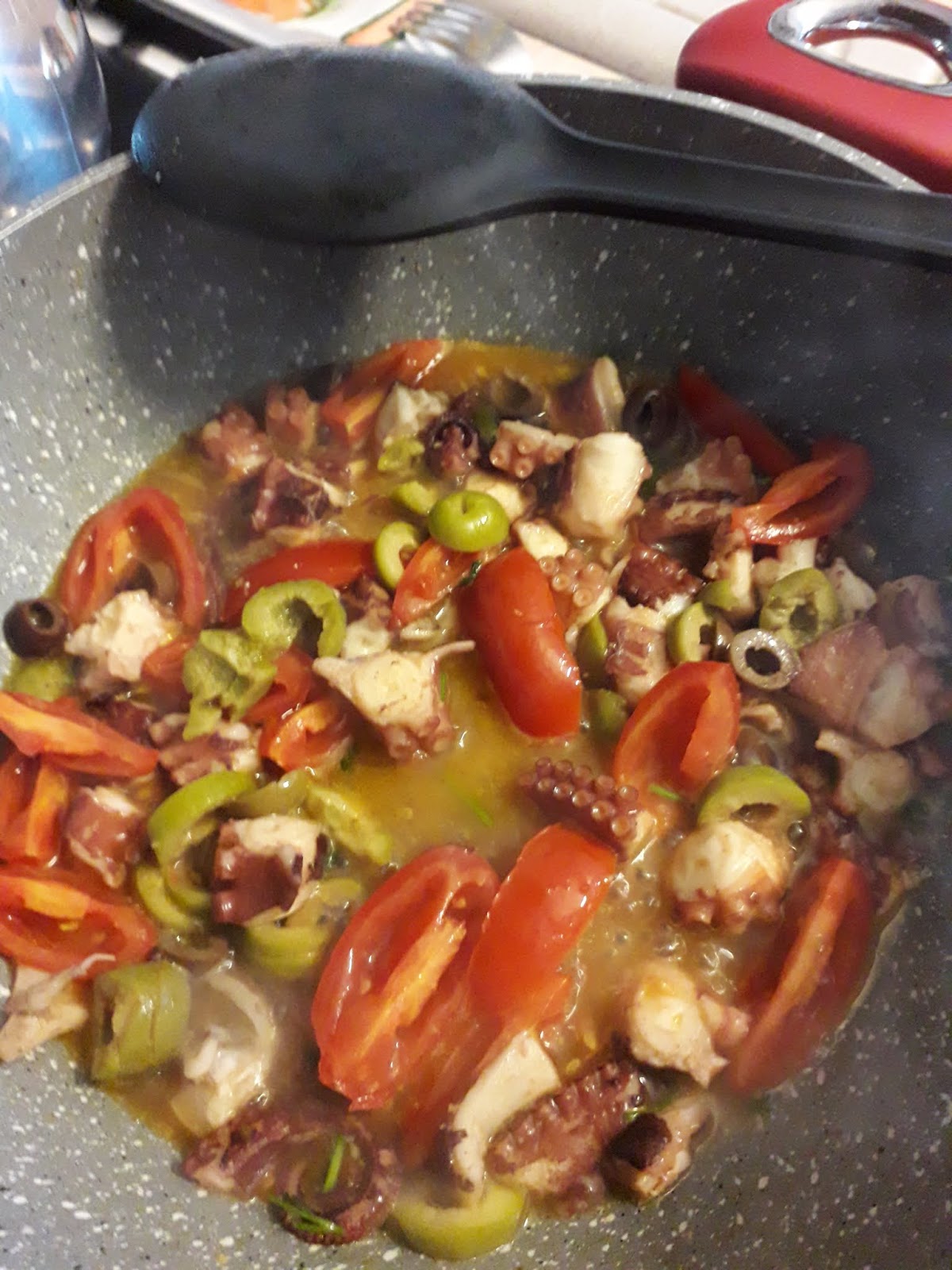 di acqua di cottura del polpo,far amalgamare qualche minuto e versare le olive,