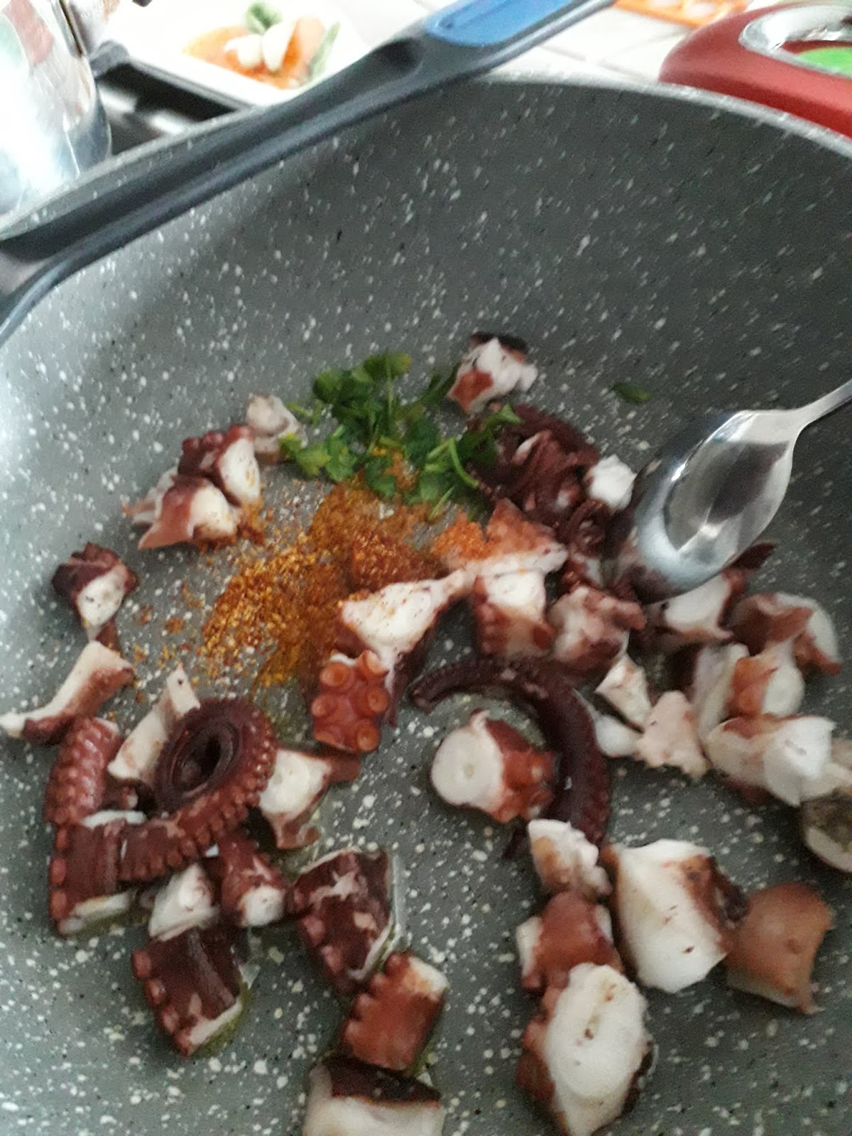 Dopo aver cotto il polpo tagliarlo a pezzetti piccoli e versarlo in una padella calda
