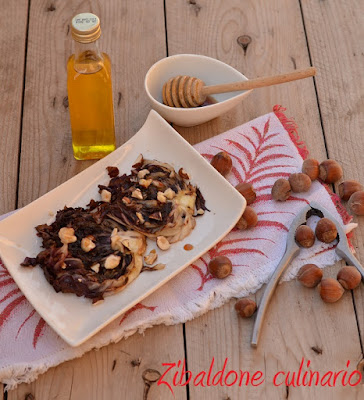 Quando risulta ben grigliato alla vista, posizionarlo sul piatto di portata, condire con un giro leggero di olio extravergine d’oliva, qualche goccia di miele e una manciata di nocciole tritate grossolanamente.