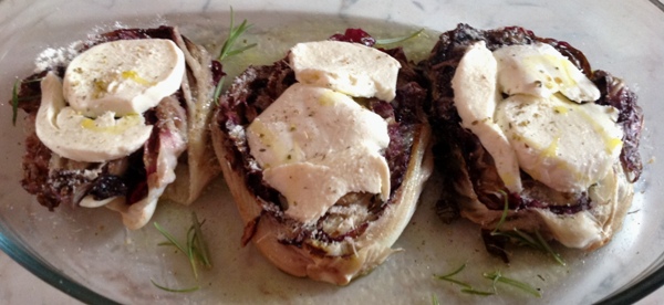 Tagliare la mozzarella a fette e disporle sopra al radicchio, salare e pepare.