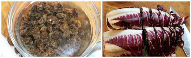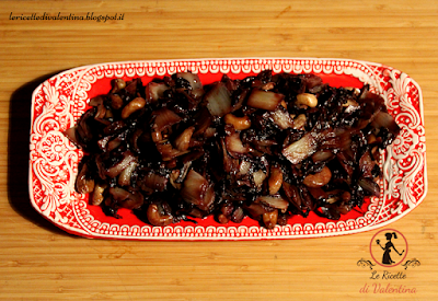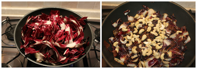 Scaldate l’olio con lo scalogno tagliato a tocchetti in una capiente padella, io ho utilizzato una salta pasta. Quando l’olio comincia a sfrigolare e lo scalogno a rilasciare il suo profumo, aggiungete le foglie di radicchio sgocciolate, saltate le velocemente per 3 minuti aiutandovi a mescolarle con due palette, quando le foglie si saranno appassite, aggiungete gli anacardi e l’uvetta ben strizzata, mescolate e condite con lo zucchero, il sale e il pepe. Sfumate con il whisky e l’aceto di mele, mescolate ancora e fate cuocere a fiamma media per 10-15 minuti finché il radicchio non sarà di un bel colore viola scuro e ben caramellato. Se serve e vedete che la verdura si asciuga troppo, potete aggiungere qualche cucchiaio di acqua a temperatura ambiente