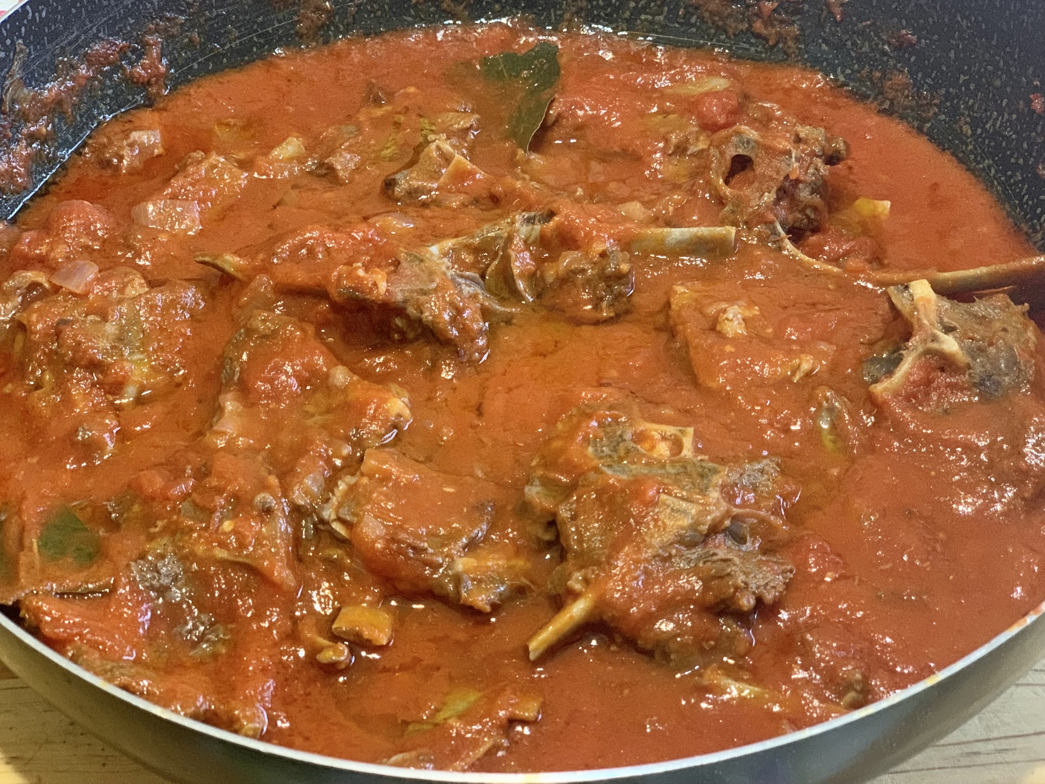 Lavate e tagliate a piccoli pezzi la carne di capra e fatela sbollentare per 15-20 minuti schiumandola spesso. Trascorso questo tempo scolatela e mettetela a rosolare in un ampio tegame con l’olio,il peperoncino e la cipolla affettata sottilmente. Fatela rosolare bene e bagnatela con un buon vino rosso.. Appena il vino è evaporato aggiungete la salsa, un mestolo d’acqua calda,le foglie di alloro e continuate la cottura a fuoco lento con il coperchio semichiuso, rimestando di tanto in tanto. Se necessario aggiungete ancora un pò d’acqua. Ci vorranno un paio d’ore, tutto comunque dipende dalla grandezza dei pezzi di carne e logicamente dall’età dell’animale.