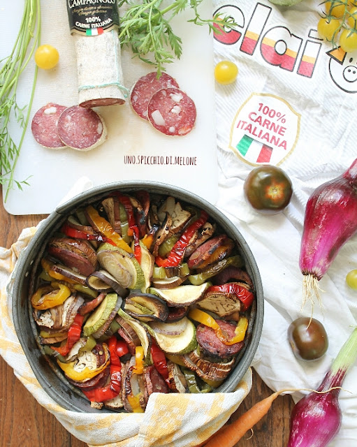 Prendete una teglia tonda ed iniziate ad alternarci le fette di verdura e di salame campagnolo CLAI.