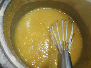 Ottenuto uno sciroppo, aggiungiamo le scorze e piano piano, a pioggia, anche 50 g di semola di grano duro mescolando con una frusta.