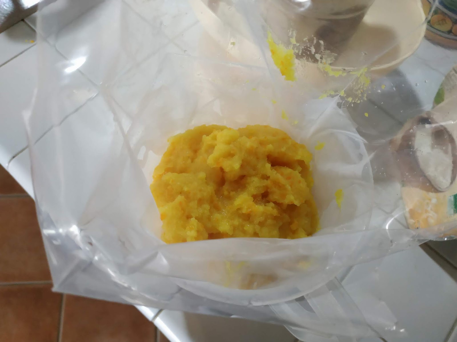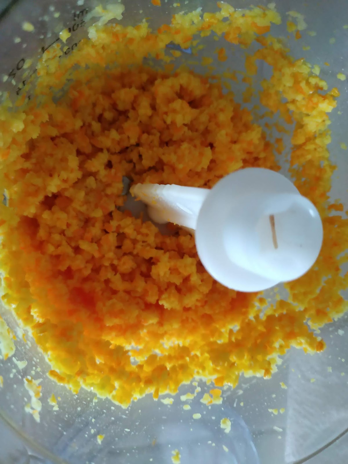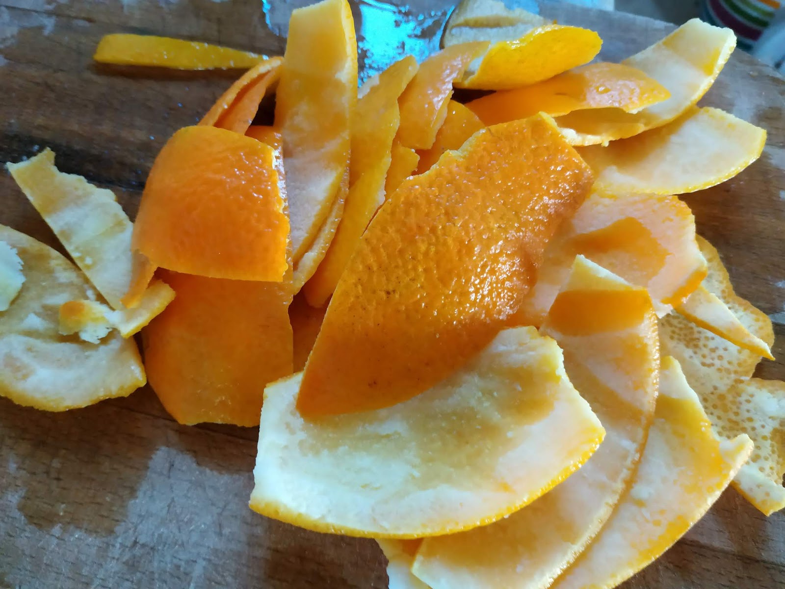 Perchè dolce del riciclo? Perchè vengono utilizzate le scorze d’arancia che usualmente buttiamo (io a dire il vero ci realizzo un sacco di cose). Quindi partiamo appunto dalle scorze; dopo aver mangiato le arance (circa 5), cerchiamo di togliere la parte bianca, quindi mettiamole in un recipiente coperte d’acqua che cambieremo spesso. Dopo due giorni, le frulliamo con un robot da cucina.