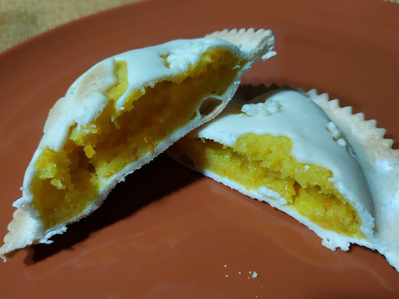 Passiamo all’impasto per l’involucro dei nostri dolcetti: 250 g di semola, 250 g di farina 00, 100 g di strutto (o burro), un pizzico di sale, un cucchiaio di zucchero, acqua fredda quanto basta.