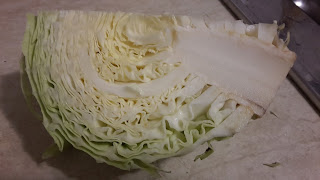 nel frattempo tagliamo sottilmente la verza eliminiamo la parte della costa più dura e la base .