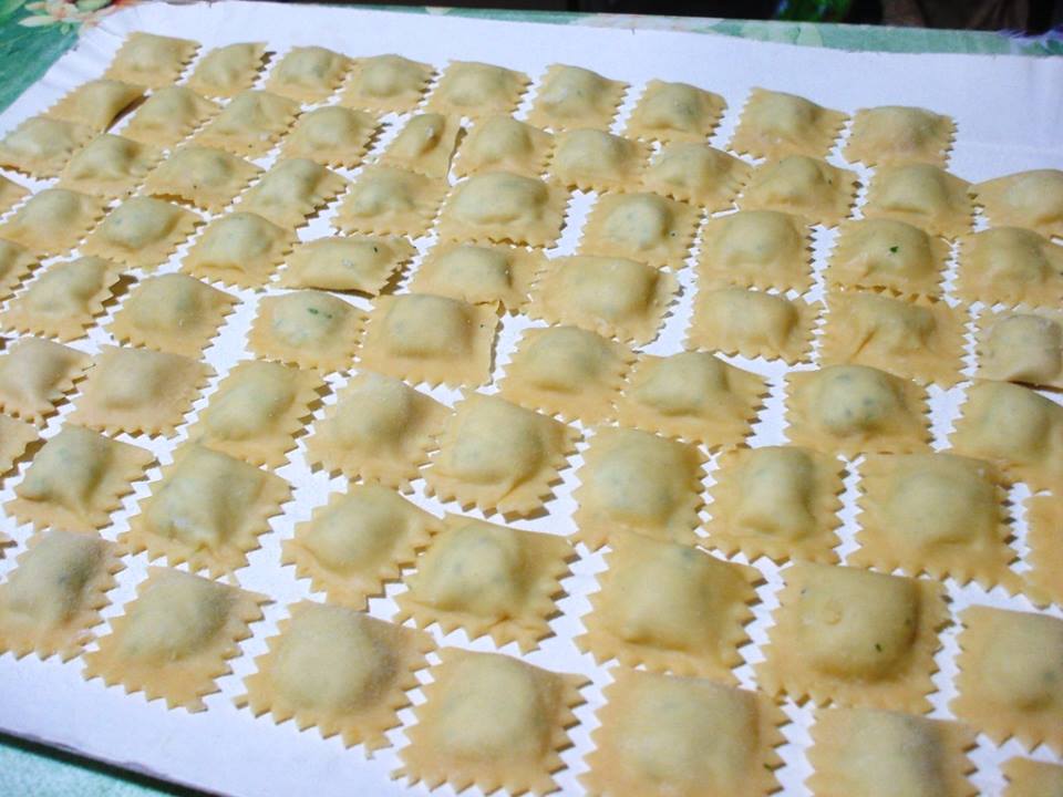 - Distribuire sulla sfoglia tanti mucchietti di impasto ravvicinati fra loro a formare una fila, ripiegarci sopra la sfoglia, premere con le dita sui bordi di ogni raviolo per fare uscire bene l’aria e saldare i bordi, poi tagliarli con la rotella dentata.