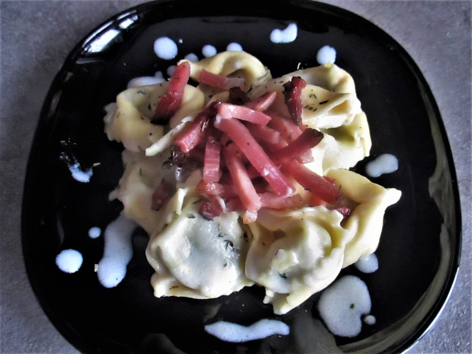 In una pentola di acqua bollente cuocete i ravioli. Fateli saltare con la salsa al parmigiano, aggiungete lo speck e servite subito.