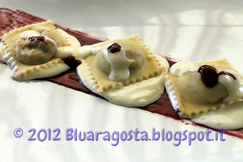 Quando avremo finito di fare la fonduta, l’acqua sarà in ebollizione. Aggiungiamo un pizzichino-ino di sale, giusto per insaporire la pasta ma attenzione perché i condimenti sono già belli saporiti, e versiamo i ravioli nella pentola. E’ pasta fresca, quindi cuocerà prestissimo, nell’arco di pochi minuti. E’ ora di preparare i piatti: una spennellata di riduzione di barbaresco, aggiungiamo i ravioli, qualche cucchiaiata di fonduta, e qualche altro goccio qui e lì di riduzione di vino. Una vera bontà! Mai storcere il naso sulla cucina del riciclo, il bisogno aguzza l’ingegno!!!