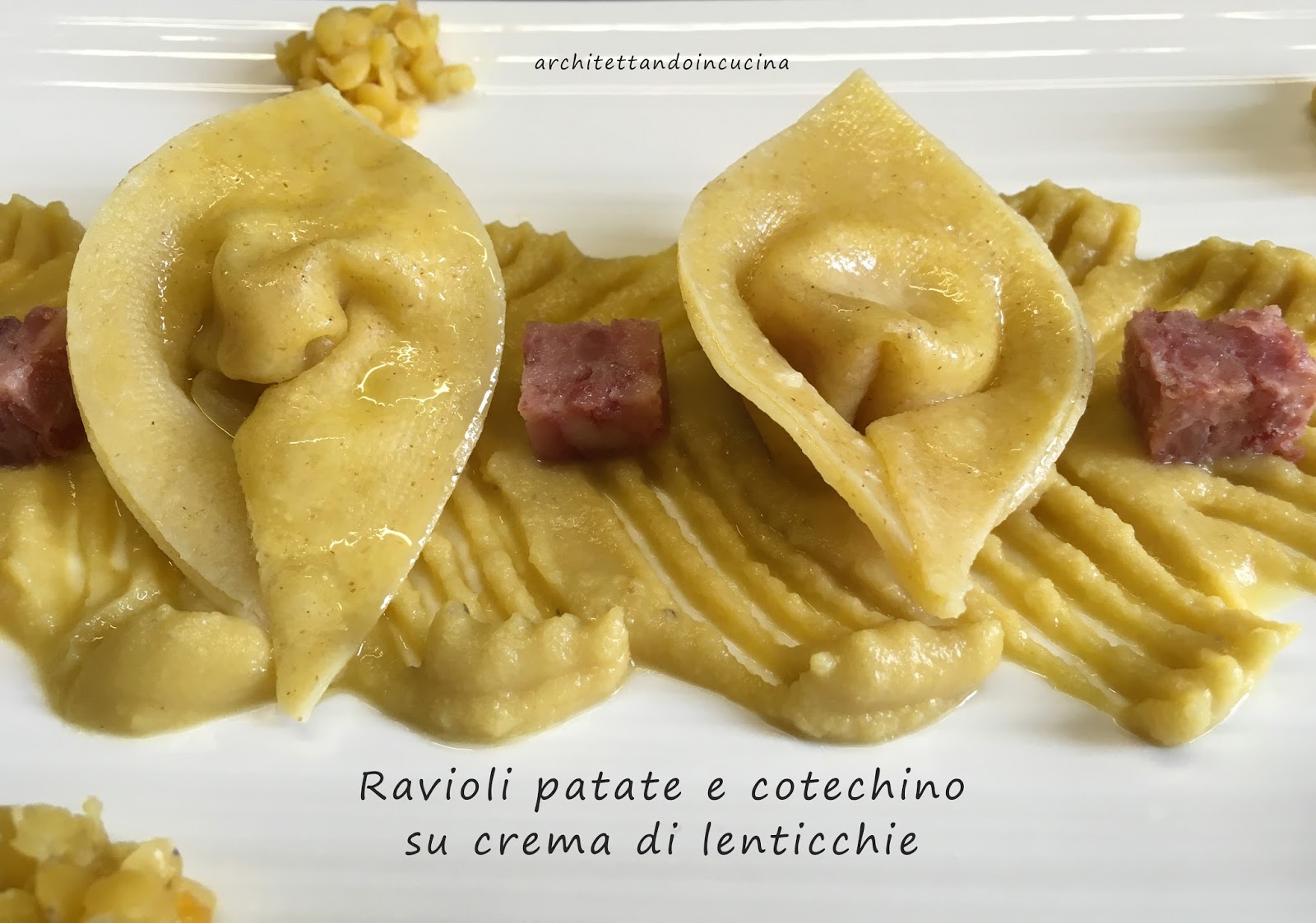 Adagiare la crema bollente sul fondo del piatto, decorarla con i rebbi della forchetta, posizionare sopra i ravioli appena scolati leggermente unti di olio extra vergine di oliva decorare con le lenticchie intere e con il cotechino tagliato a dadini e riscaldato in padella antiaderente.