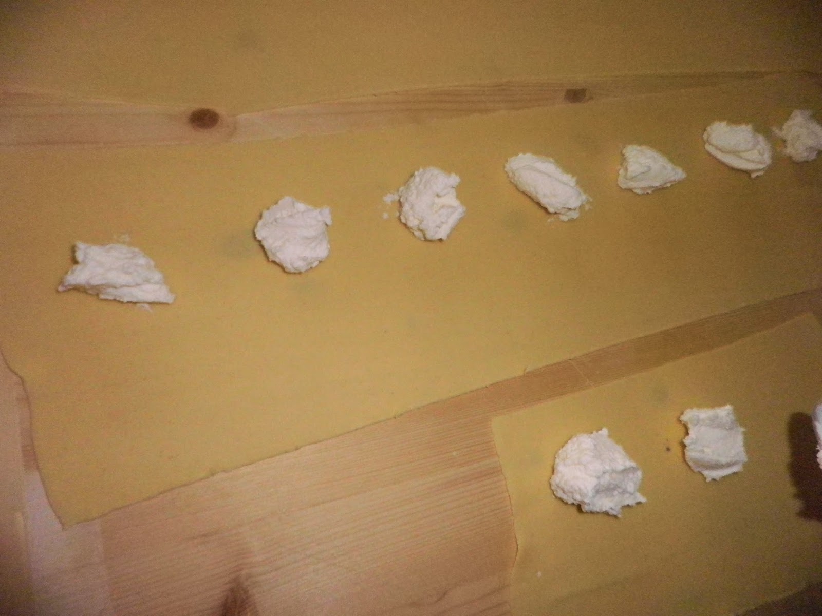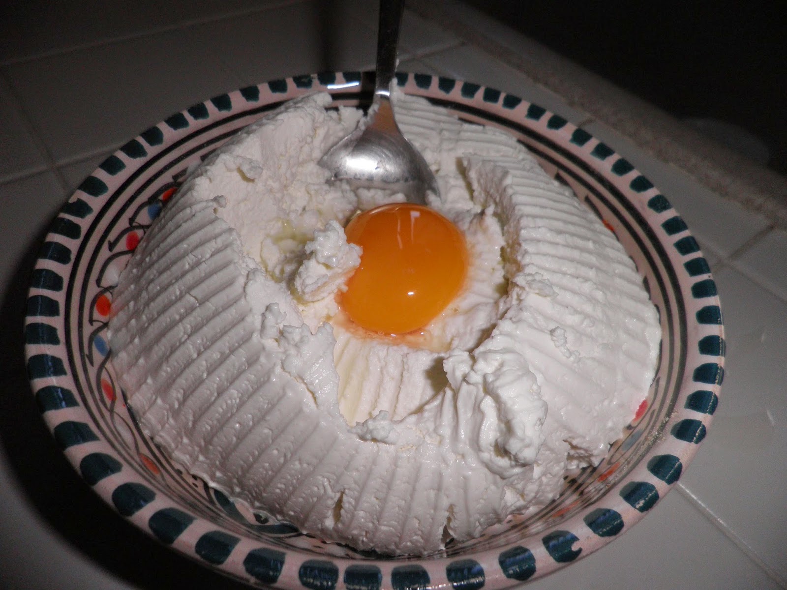 Aggiungere a 500 g di ricotta vaccina un tuorlo d’uovo e un pizzico di pepe nero ( a piacere qualche fogliolina di maggiorana).
