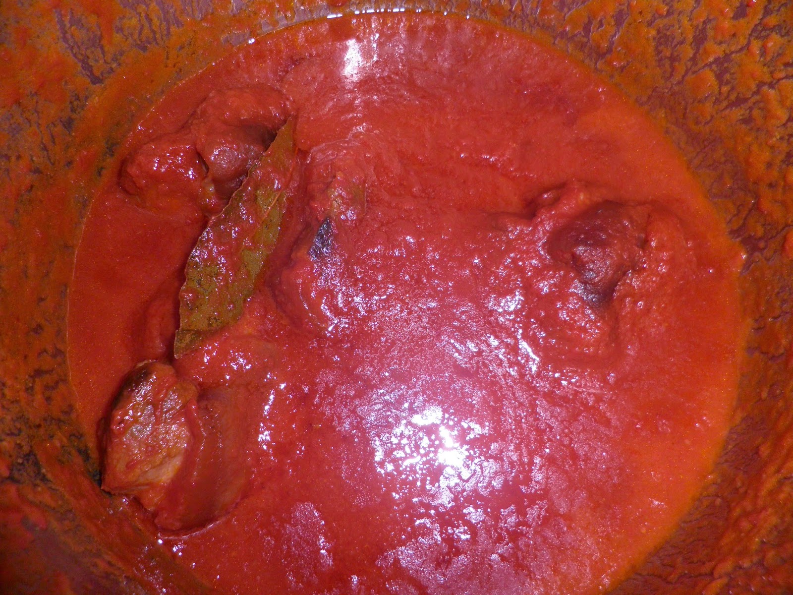 Aggiungere tre bei cucchiai di concentrato di pomodoro (ancora noi lo facciamo in casa vedi come) e sciogliere con tanta acqua quanto basta. Fare cuocere per almeno un’ora. Aggiungere anche una foglia di alloro.