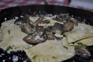 Per il condimento faccio rosolare i porcini con olio extravergine di oliva, uno spicchio d’aglio, prezzemolo, sale e pepe. Quando saranno pronti faccio saltare i ravioli che ho fatto cuocere in abbondante acqua salata.