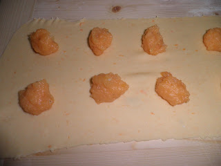 Con un cucchiaio dispongo il ripieno su una sfoglia, ricopro con un’altra sfoglia e chiudo bene i bordi premendo con una forchetta.