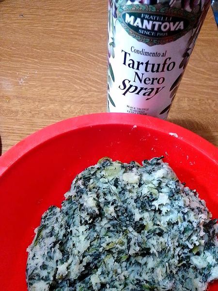 cicoria lessata e ripassata in padella con poco olio , poco aglio e un pizzico di sale e poi tritata.