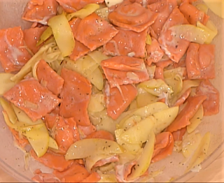 Cuocere i ravioli in acqua bollente salata, scolarli e versarli nella padella con la salsa si mele, far insaporire e servire subito.