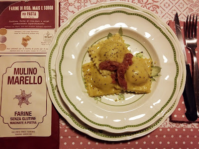 Cuocete i ravioli senza glutine in abbondante acqua bollente, per 2-4 minuti dopo che saranno saliti in superficie. Dipende dallo spessore della pasta, assaggiatene sempre uno per regolarvi. Una volta cotti saltateli con del burro fuso aromatizzato da un poco di salvia, e serviteli così.