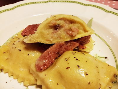 Meglio preparare prima il ripieno per i ravioli senza glutine. La pasta asciuga in fretta, e farla attendere non è possibile. Tagliate a tocchettini il cotechino, unitevi le patate lesse ben ridotte a purea con una forchetta, e condite con poco timo ed abbondante origano. Salate, ed è fatto.