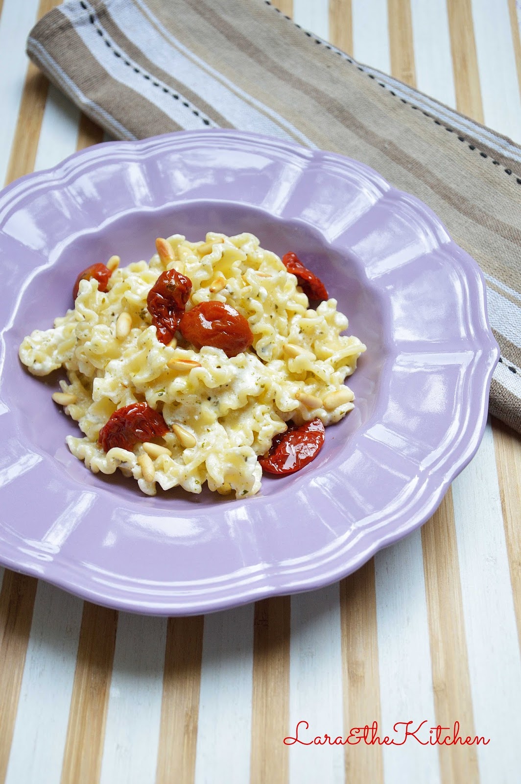 Decorate ogni piatto con i pinoli tostati e qualche pomodorino secco sott’olio.
