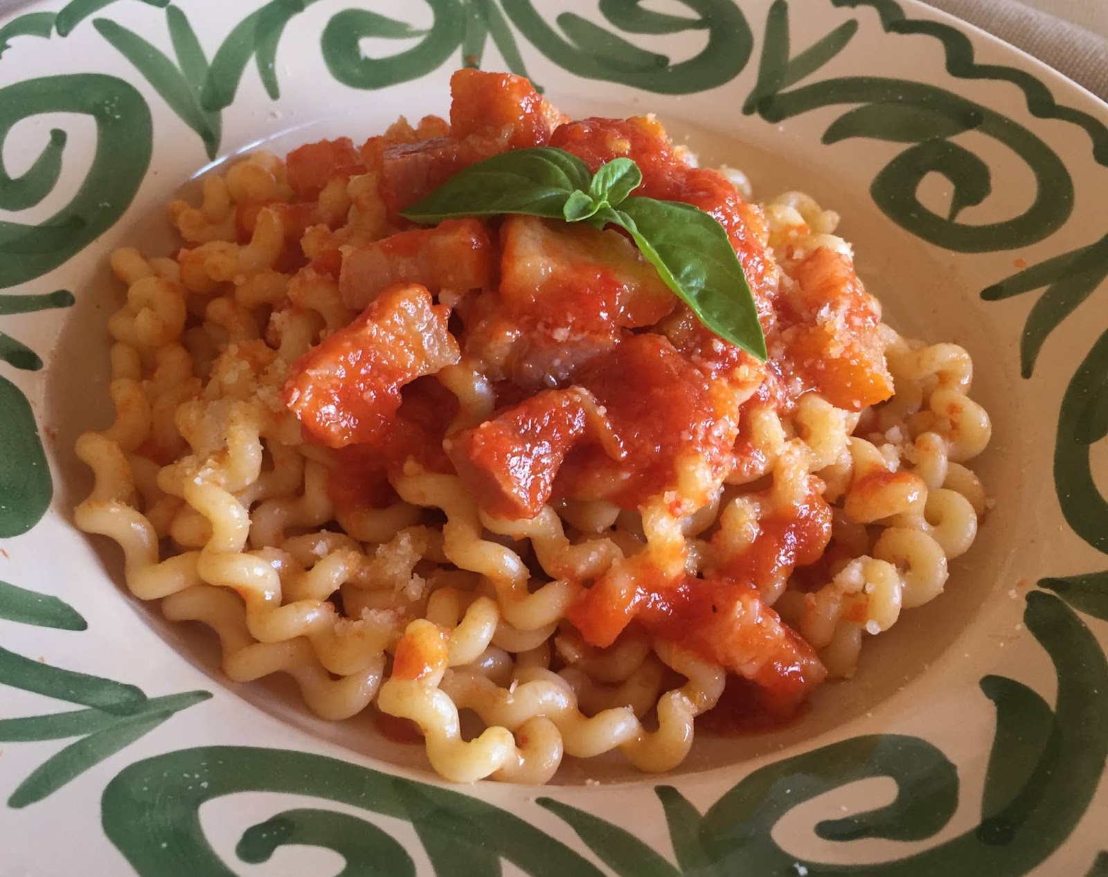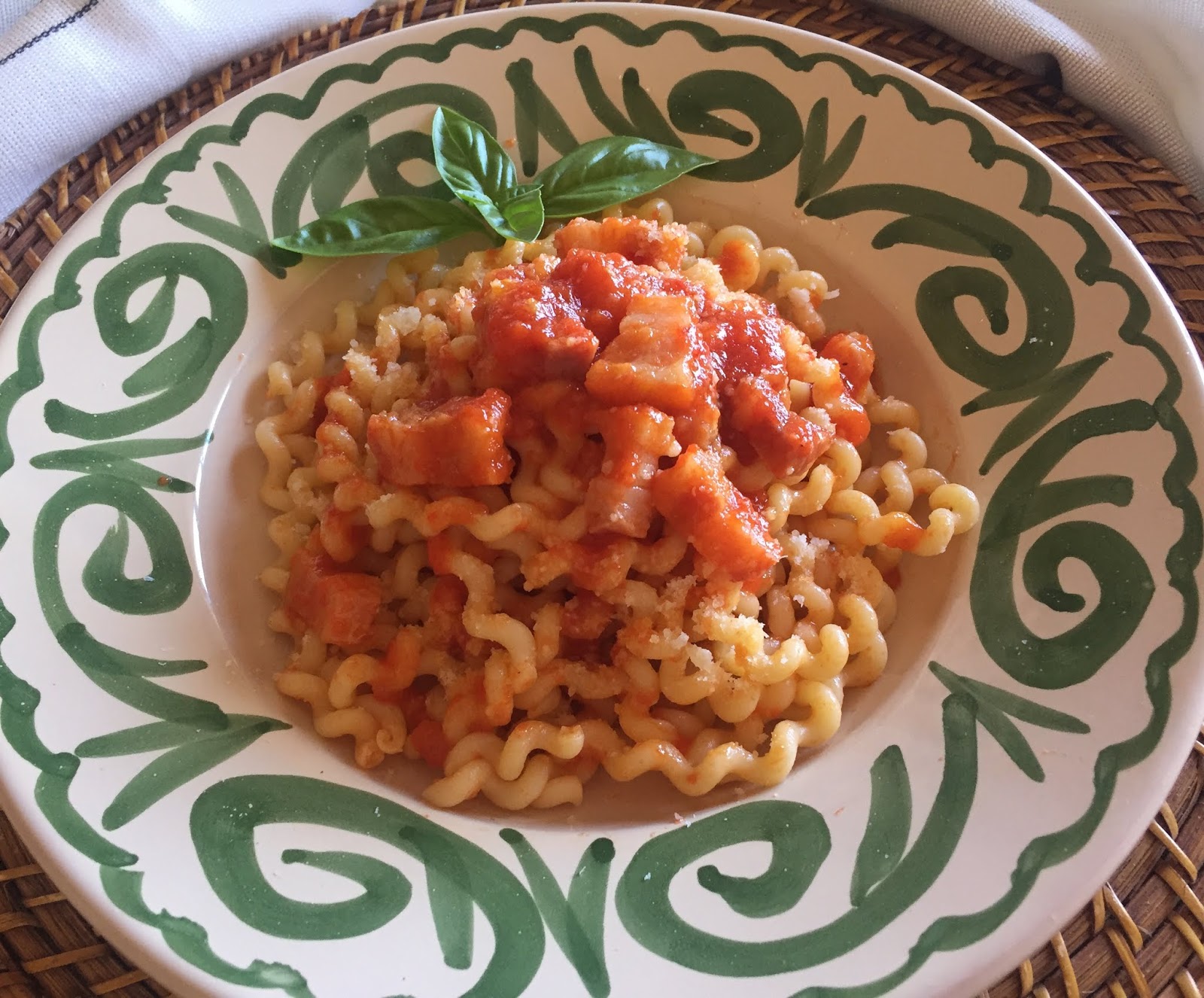 Mi piace andare alla riscoperta di quei piatti della nostra tradizione contadina che rischiano di essere dimenticati. Un tesoro sommerso che andrebbe conosciuto e valorizzato per la sua bontà e la sua storia. E nonostante il nome che potrebbe trarre in inganno, la paternità di questo piatto è proprio calabrese. Esiste un’altra versione in Puglia ma è totalmente diversa, utilizza infatti acciughe, zucchine, pomodori, olive, capperi e …spaghetti. La ricetta originale calabrese prevede invece un sugo con guanciale, pomodori e peperoni e al posto degli spaghetti una pasta fatta in casa con solo acqua e farina e lavorata col “ferretto”. E “i ricci ‘e fimmina” – ricci di donna – si ottengono arrotolando la pasta a spirale attorno ad un ferro da calza che, pensate un pò, un tempo veniva dato in dote alla sposa che, secondo la tradizione, doveva saper fare 15 tipi di pasta ‘e casa. Io ho preferito comprare dei fusilli e sinceramente tanti tipi di pasta non li so fare.
