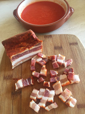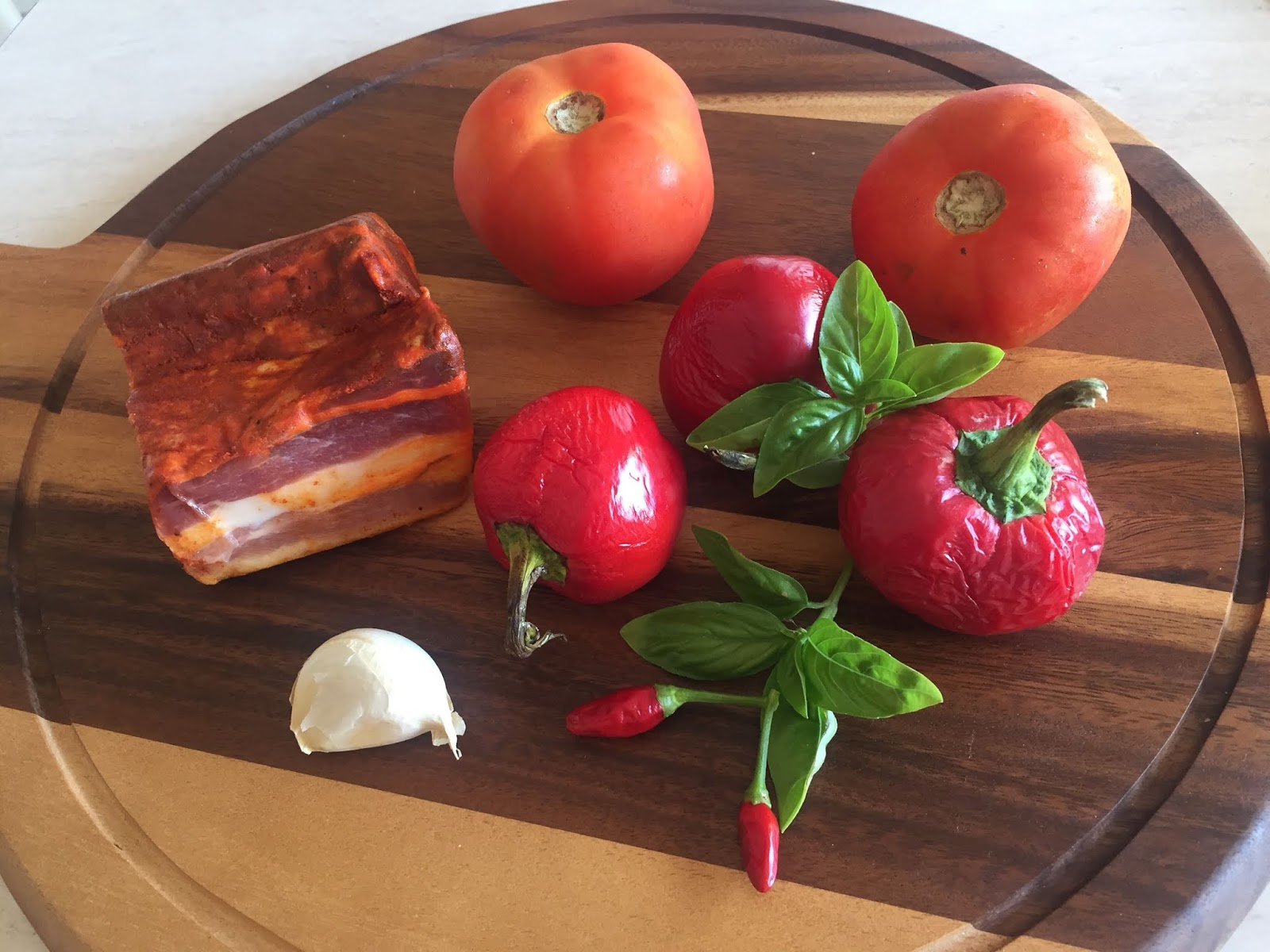 In una padella capiente versate l’olio evo e fate imbiondire lo spicchio d’aglio, aggiungete il guanciale tagliato a tocchetti e appena sarà trasparente versate la salsa ottenuta dai pomodori e peperoni. Fate cuocere a fuoco dolce per 10/15 minuti e prima di spegnere togliete l’aglio e aggiungete le foglie di basilico e regolate di sale.